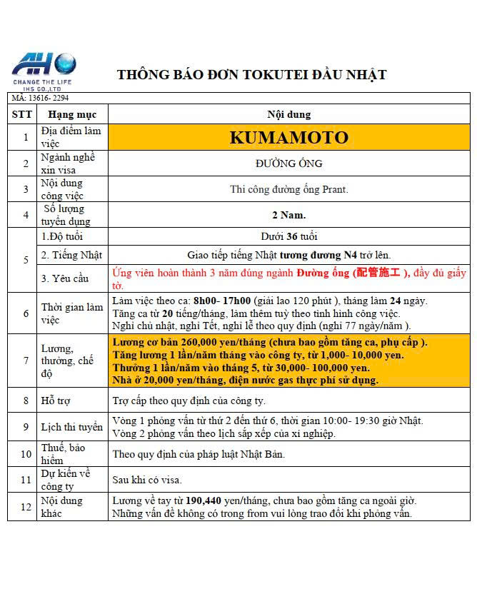 | Địa điểm làm việc | Kumamoto, Kyushu |