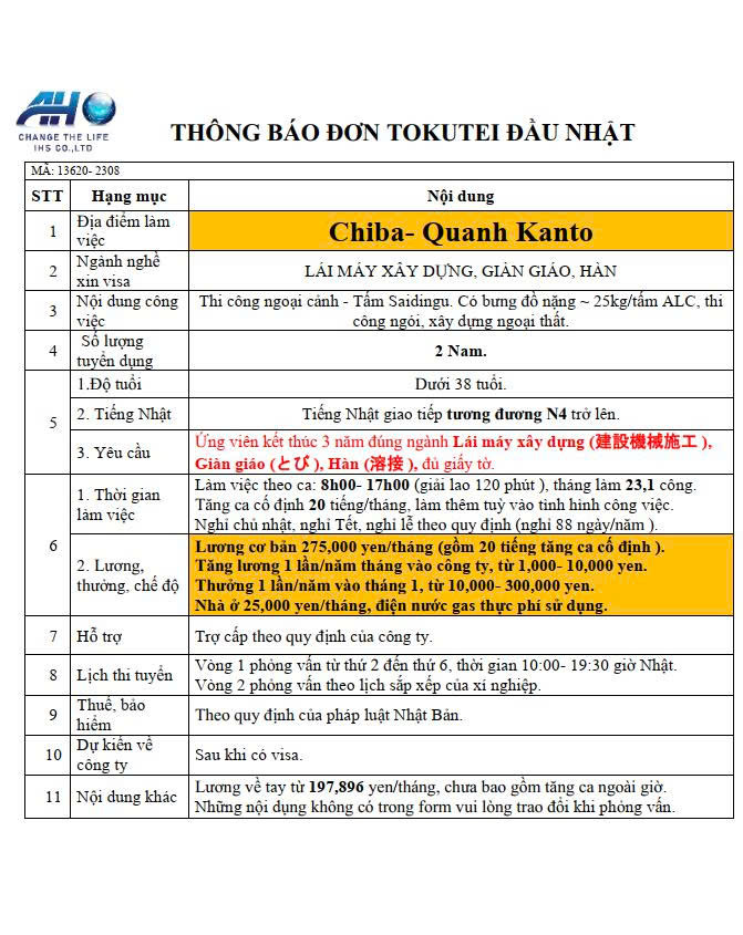 | Ngành nghề xin visa | Lái máy xây dựng |