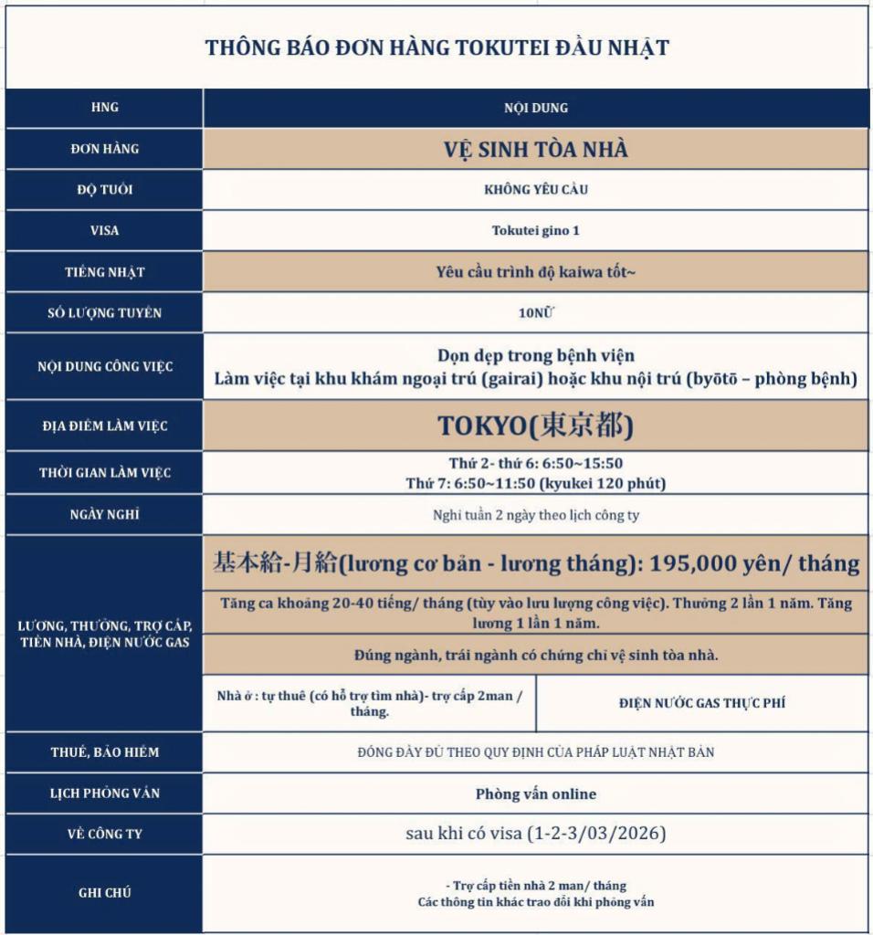 | Loại hình Visa | Tokutei đầu Nhật |