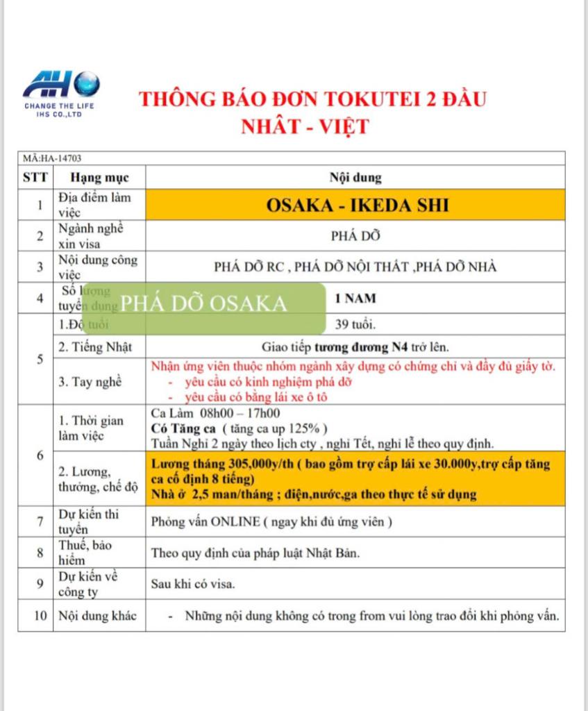 | Địa điểm làm việc | Osaka, Kinki (Kansai) |
