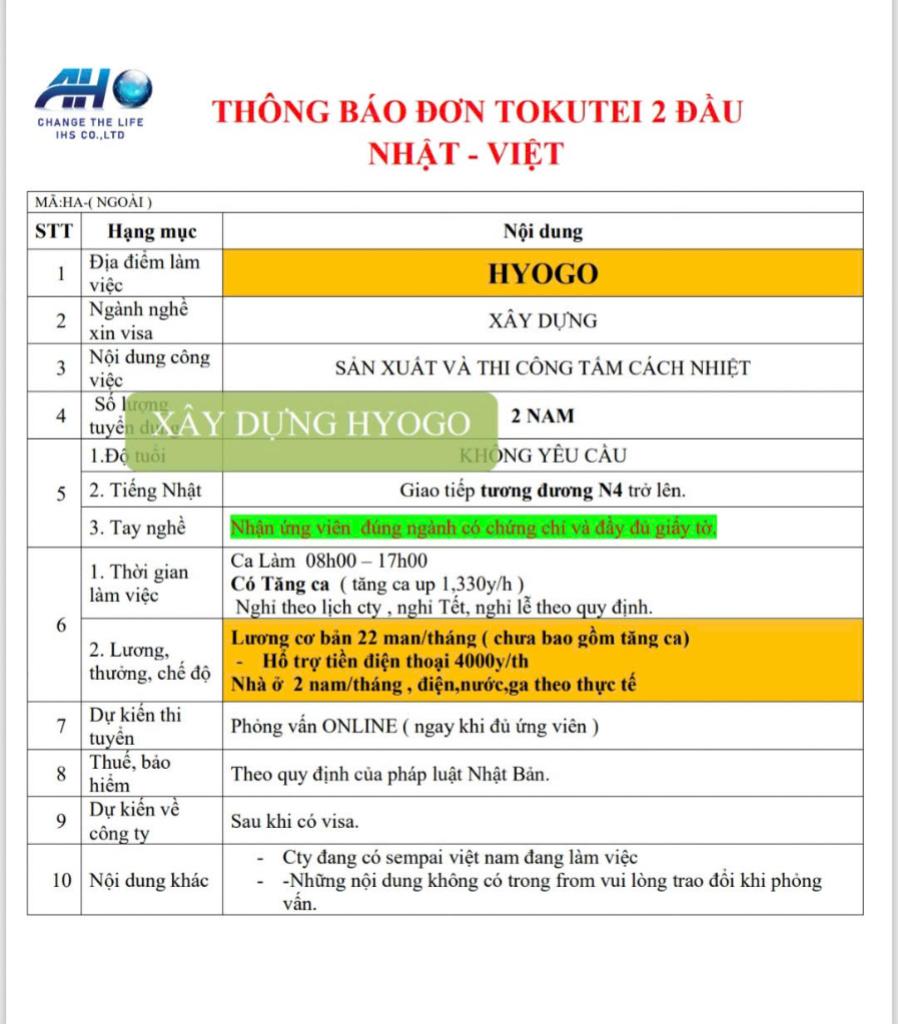 | Ngành nghề xin visa | Xây dựng tổng hợp |