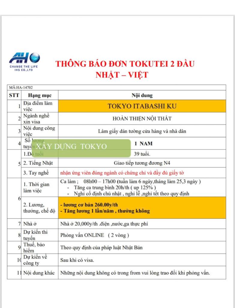 | Ngành nghề xin visa | Xây dựng tổng hợp |