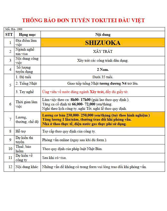 | Địa điểm làm việc | Shizuoka, Chubu |