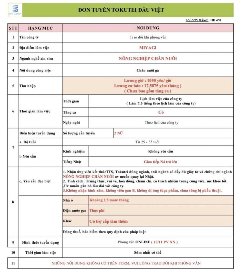 | Địa điểm làm việc | Miyagi, Tohoku |