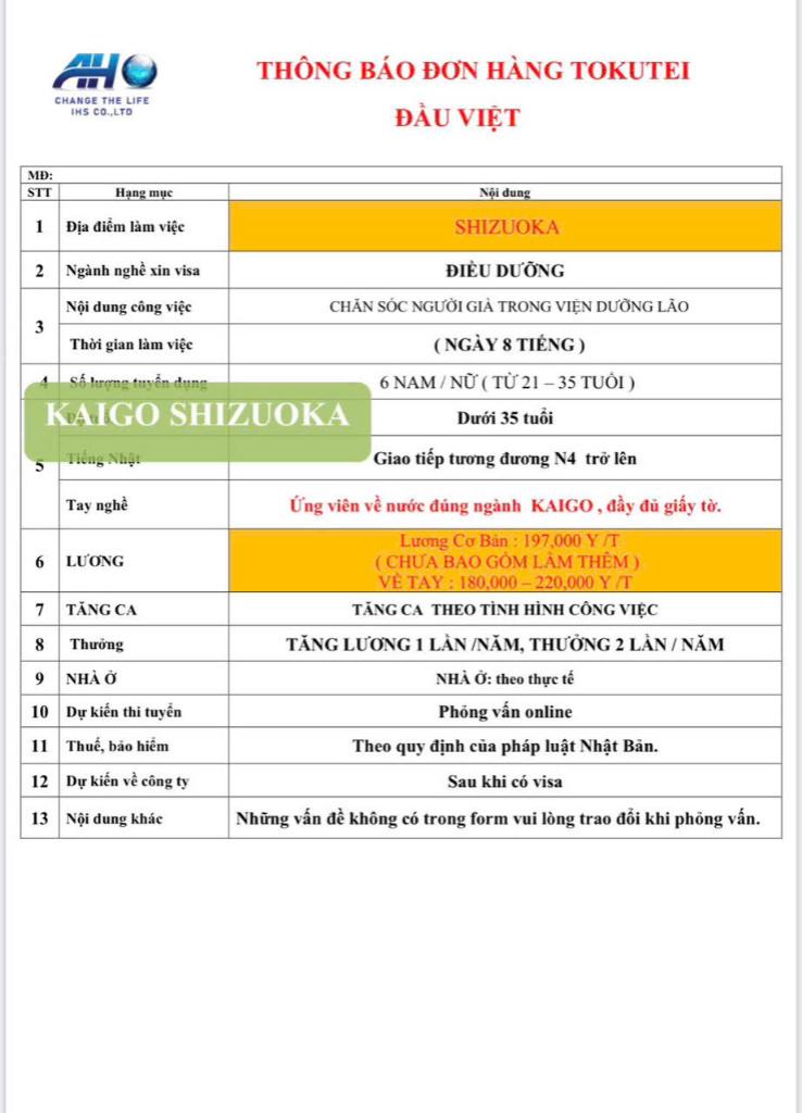 | Ngành nghề xin visa | Điều dưỡng, hộ lý |